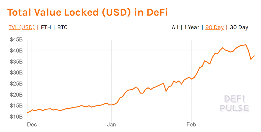 Esta influencia se hizo evidente durante el evento de precios que tuvo lugar el 22 de febrero, a menudo denominado “Lunes sangriento”. Además de Bitcoin y la gran mayoría de las altcoins, el mercado DeFi también experimentó una caída de valor. El valor total bloqueado del mercado cayó de un máximo histórico de casi 43 mil millones de dólares el 22 de febrero a 36,16 mil millones de dólares el 24 de febrero.