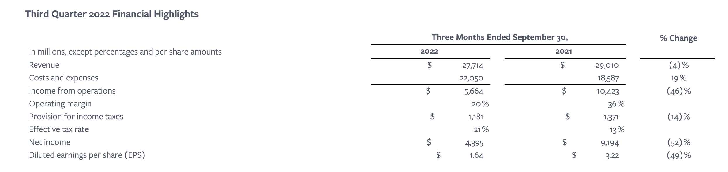 Esta disminución se agrava cuando se contabilizan los gastos, que aumentaron casi 20% en comparación con el tercer trimestre de 2021. En total, esto resultó en una enorme caída del 52% en los ingresos netos, a 4,400 millones de dólares desde 9,200 millones de dólares el año pasado.