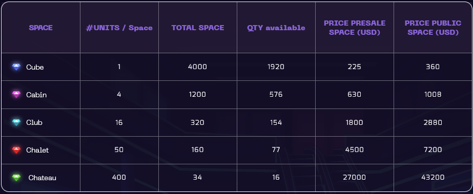 Actualmente Metamall, posee 5714 espacios relacionados para venta. Sin embargo piensa lanzar una preventa por tiempo limitado, en ella se lanzarán 2743 espacios, es decir el 48% de los espacios totales. Los espacios virtuales se encuentran valuadas en un amplio rango de precios; desde 360 dólares estadounidenses, hasta 43,200 dólares el más costoso.
