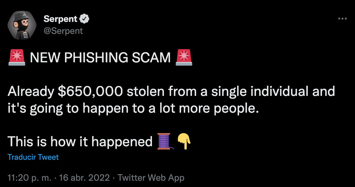 El usuario de Twitter @Serpent, reconocido también por ser analista de NFT y estafas de criptomonedas, fue el encargado de describir cómo un grupo de ciberdelincuentes robaron a la víctima.