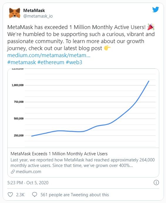 El floreciente mercado DeFi ha acelerado el crecimiento y la popularidad de las wallets de criptomonedas como Metamask, que acaba de alcanzar un millón de usuarios activos mensuales.
