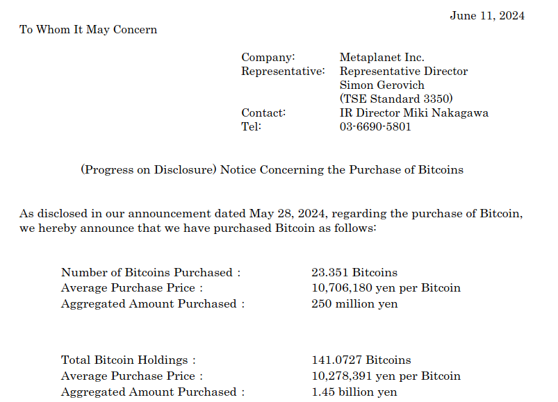 Desde entonces, la empresa ha continuado adquiriendo la criptomoneda en varias ocasiones, acumulando un total de 141 Bitcoin por un valor de 1,45 mil millones de yenes, con un precio promedio de compra de 10,278,391 yenes (aproximadamente 65,000 dólares) por Bitcoin.