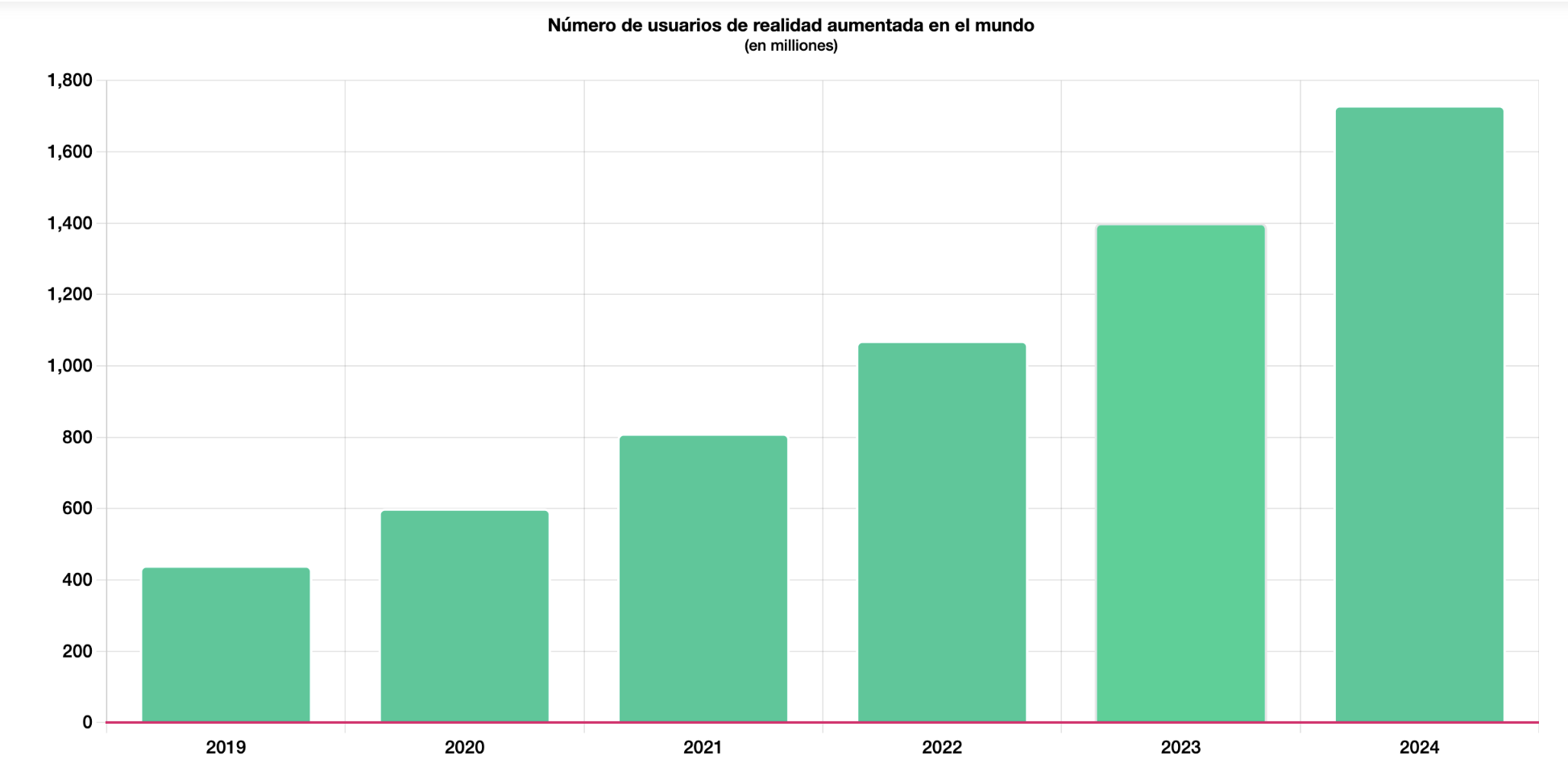 El nuevo reporte de Hellosafe sostiene que el crecimiento del metaverso vendrá acompañado de una llegada paulatina pero masiva de usuarios, los cuales serán 1,700 millones para 2024, puesto que en este año había 1,070 millones de usuarios de realidad aumentada. El boom de nuevos usuarios se dio entre 2019 y 2022, cuando se sumaron 630 millones de usuarios.