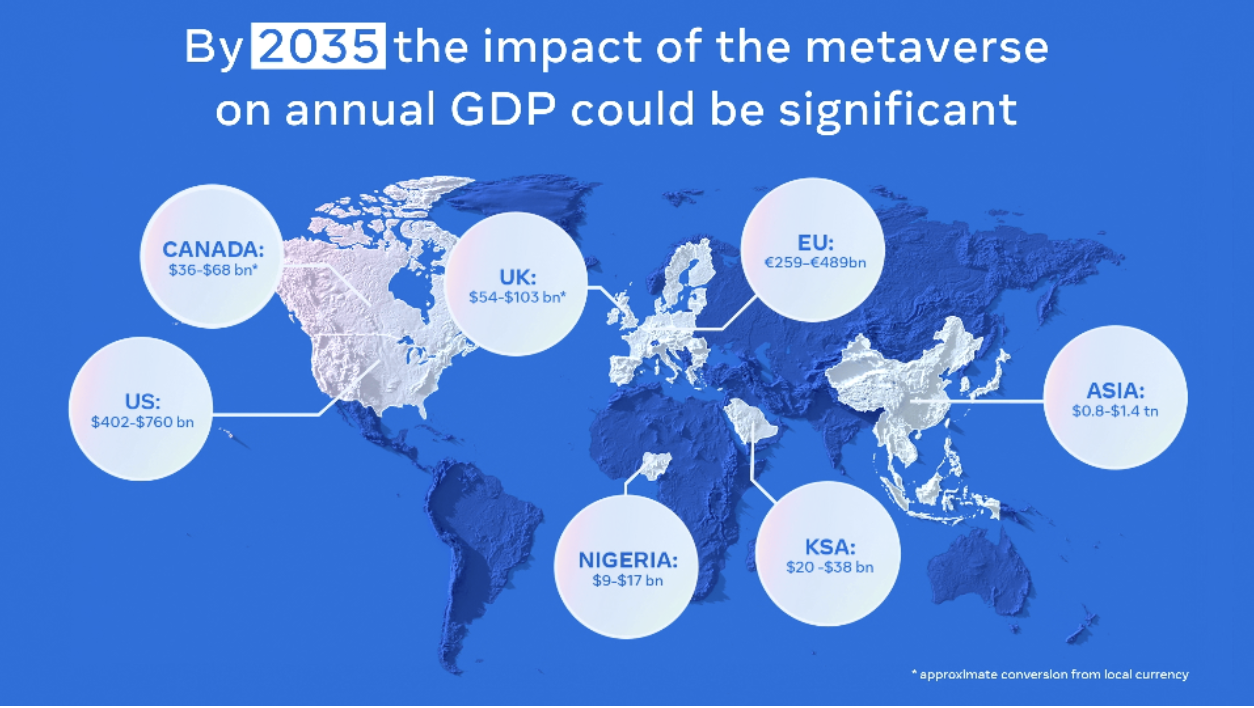 “El metaverso se encuentra en las primeras etapas de desarrollo, pero los beneficios para la economía mundial podrían alcanzar hasta 3,6 billones de dólares estadounidenses por año en PIB adicional para 2035.”