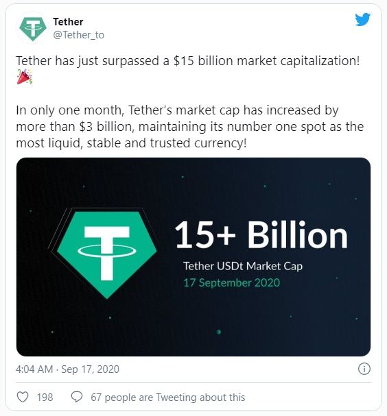 La capitalización total de mercado de Tether (USDT) ha superado por primera vez los 15 mil millones de dólares. El sector de DeFi en constante expansión parece estar impulsando el uso de la controvertida stablecoin.