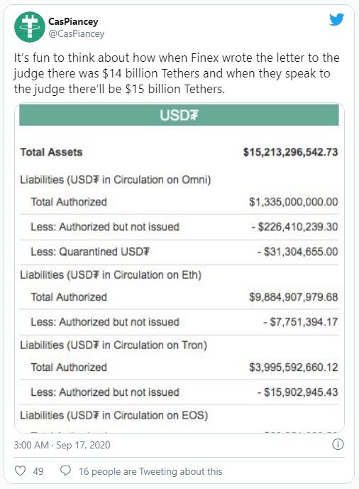 Sin embargo, el creciente mercado de Tether sugiere que los usuarios no están demasiado preocupados por la batalla legal. Como destaca el usuario de Twitter CasPiancey (@CasPiancey) a continuación, la cantidad de USDT en circulación creció alrededor de 1 mil millones de dólares en los pocos días posteriores a la respuesta de Bitfinex a la OAG: