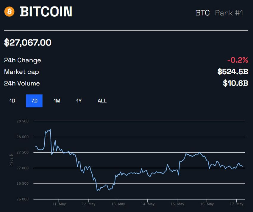 El precio de BTC se está consolidando actualmente alrededor del rango de los 27,000 dólares. El “rey de las criptomonedas” no se ha movido mucho desde el fin de semana, pero ha perdido un 5.3% en las últimas dos semanas.
