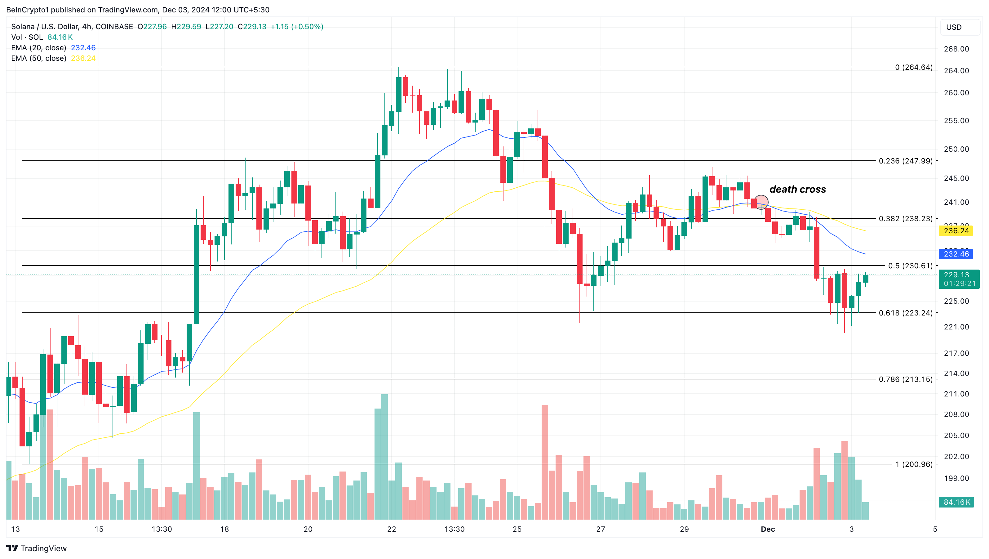 Además, el precio de SOL cotizando por debajo de ambos indicadores clave respalda esta perspectiva bajista. Esta posición sugiere que el reciente rebote podría ser un engaño. Si se confirma, el precio de Solana podría potencialmente caer aún más a 213.15 dólares.