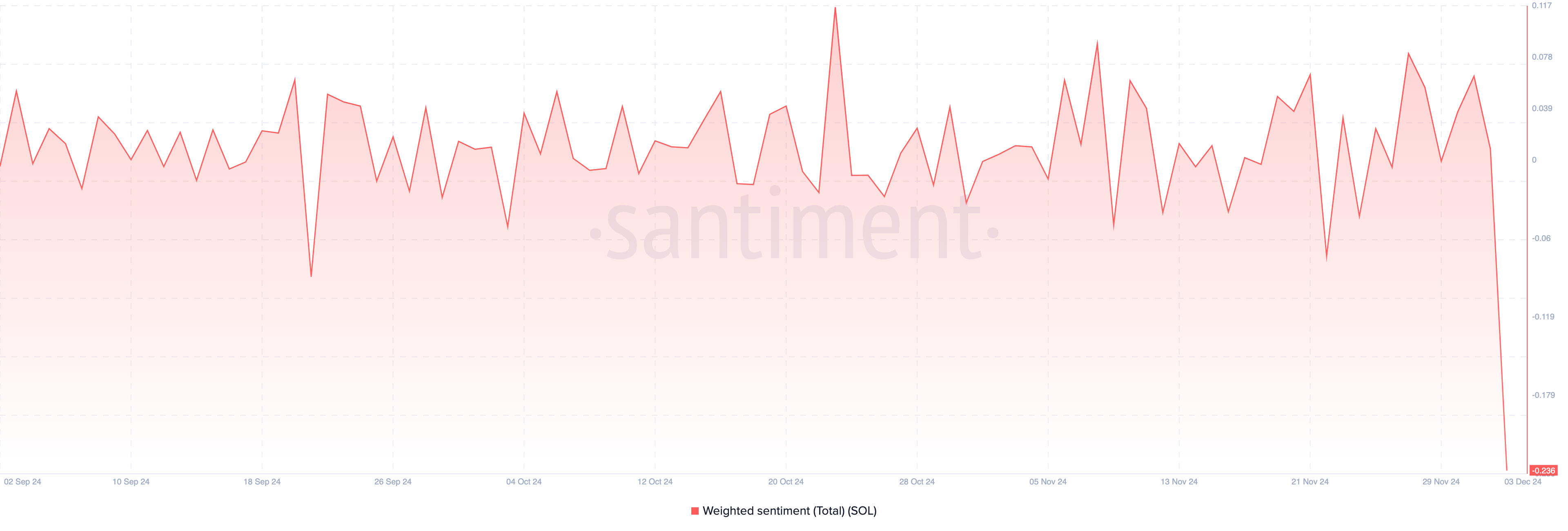 Según Santiment, el sentimiento ponderado de Solana ha caído a territorio negativo, lo que sugiere que la mayoría de los participantes del mercado no son alcistas sobre la acción del precio a corto plazo de SOL.