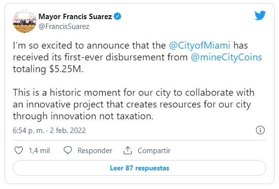 El 02 de febrero, el alcalde de la ciudad estadounidense de Miami, Francis Suárez, confirmó mediante su cuenta oficial en Twitter, el recibimiento de 5,25 millones de dólares de parte del proyecto de criptomonedas MiamiCoin.