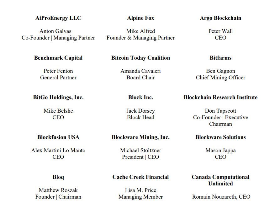 La carta enviada a la EPA fue firmada por más de 50 directivos de empresas como Argo Blockchain, Benchmark Capital, Bitfarms, Block Inc, Fidelity Investment, Grayscale, Galaxy Digital, Iris Energy, Lancium, Luxor Technology, Marathon Digital, Mawson Infrastructure, NFX, Monbanc Corporation, SkyBridge Capital, NYDIG, Riot Blockchain, US Bitcoin Corp, entre otros.