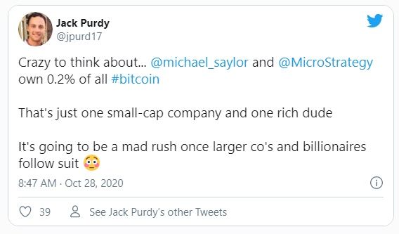 Jack Purdy de Messari señaló que Saylor y MicroStrategy combinados “poseen el 0,2% de todos los Bitcoin”, pronosticando que habrá una “fiebre loca una vez que las grandes empresas y los multimillonarios sigan su ejemplo”.