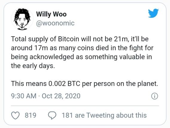 Concluyendo que se traducirá en una oferta que puede acomodar “0.002 BTC por persona en el planeta”. Los seguidores de Woo concluyeron que se refiere a las claves que se perdieron al principio.