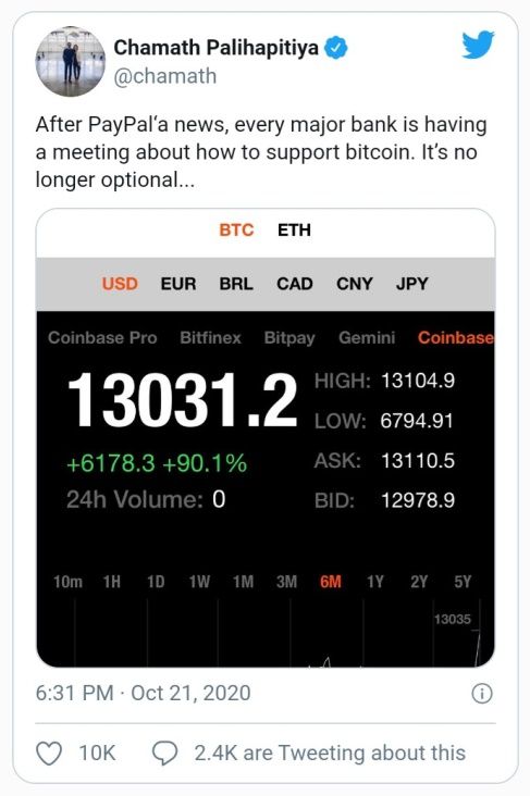 El multimillonario de capital de riesgo, Chamath Palihapitiya, es otro toro de Bitcoin. El jefe de Social Capital respondió al posiblemente el mayor titular del año de la industria de las criptomonedas, que fue que PayPal admitirá transacciones con criptomonedas en su plataforma de pagos.