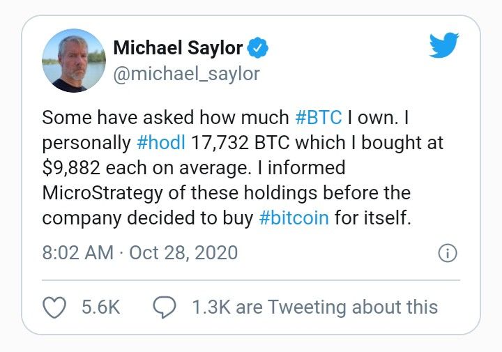 En un tweet, Saylor reveló sus tenencias personales de Bitcoin, diciendo que está “acumulando” más de 17,730 BTC que, para el momento, obtuvo una valor promedio de 9,882 dólares. Saylor dijo que reveló sus posesiones personales después de que se le preguntó al respecto en Twitter luego de la inversión de 425 millones de dólares en BTC por parte de su empresa.