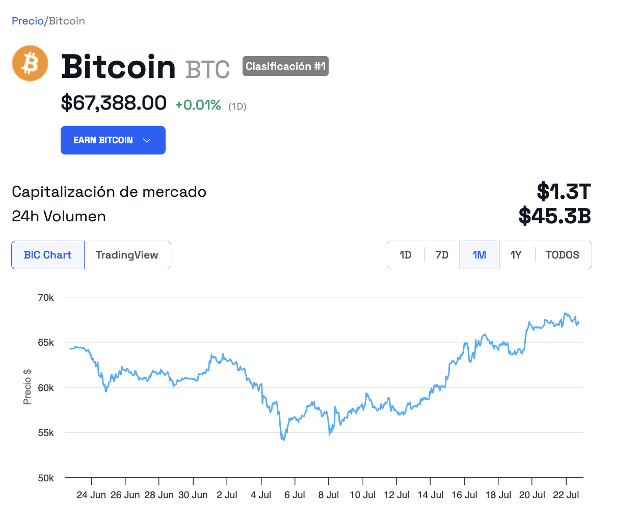 Finalmente, Michael Saylor acompañó el gráfico con la frase “Bitcoin es la única forma de salir adelante”. El precio de Bitcoin cotiza en 67,370 dólares el 22 de julio, horas después de alcanzar los 68,000 dólares, tras la renuncia de Joe Biden a la candidatura presidencial de Estados Unidos. En la última semana, BTC ha ganado 6,10%, mientras que su capitalización de mercado se ubica en 1,3 billones de dólares.