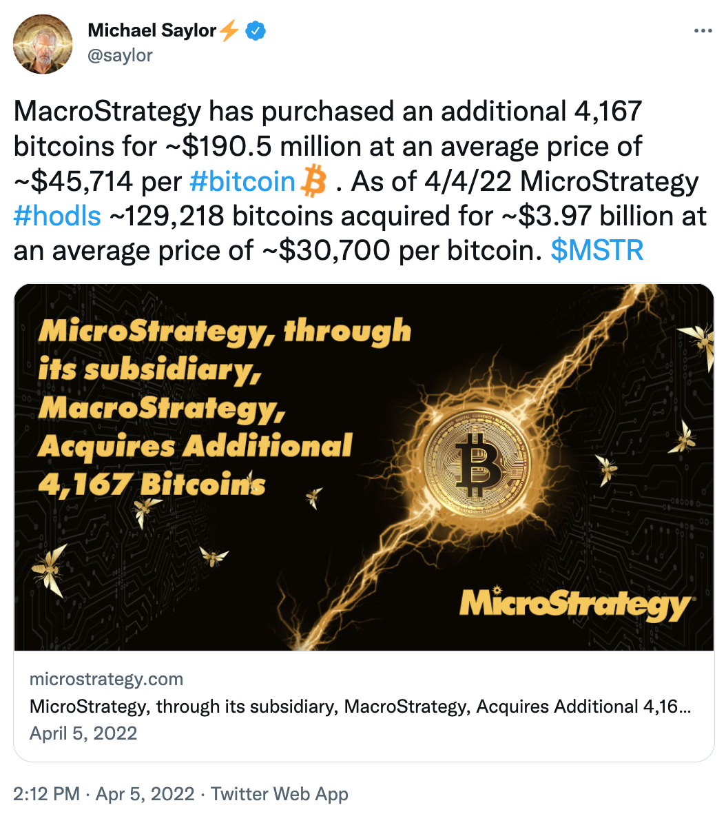 SponsoredNo es nuevo que la empresa dirigida por Michael Saylor compre bitcoin, sin embargo es la primera vez que se utiliza bitcoin como garantía para un préstamos para poder adquirir más bitcoin. Pocas jornadas después MacroStrategy ha confirmado la adquisición de 4167 BTC, unos 190 millones de dólares al escribir este artículo. La compra representa más del 90% del total del préstamo.