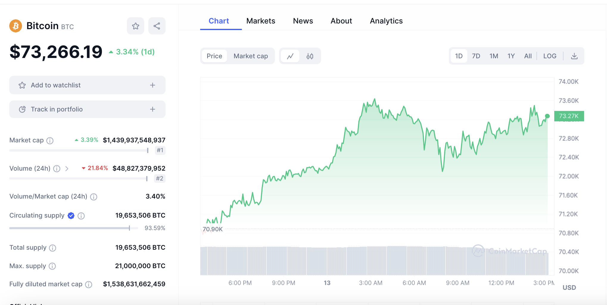 Durante el anuncio de MicroStrategy, el precio de Bitcoin se dirige hacia un nuevo máximo histórico (ATH) tras haber superado los 73,635 dólares en las primeras horas del 13 de marzo. El crecimiento de BTC en el último mes ha sido de 48%, de 9,31% en una semana y 3,23% en solo 24 horas, un rally que supera el 100% en los últimos meses, de acuerdo con CoinMarketCap.