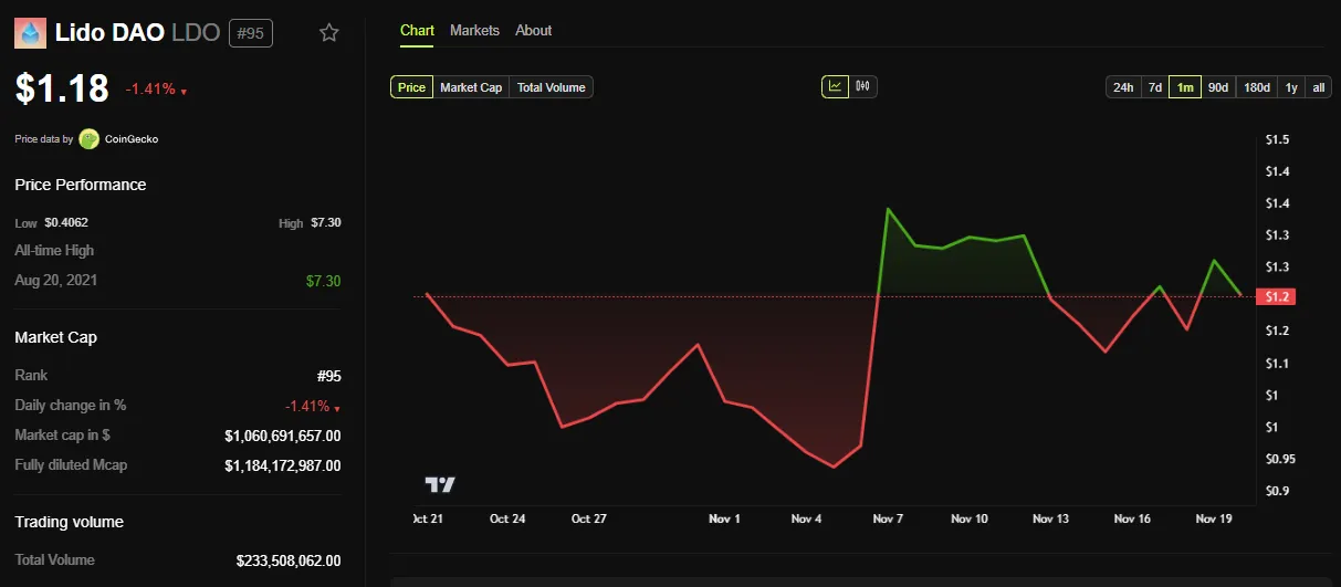 El token LDO de Lido DAO ha bajado casi 2% con esta noticia. Al momento de escribir este artículo, se cotiza a 1,18 dólares.