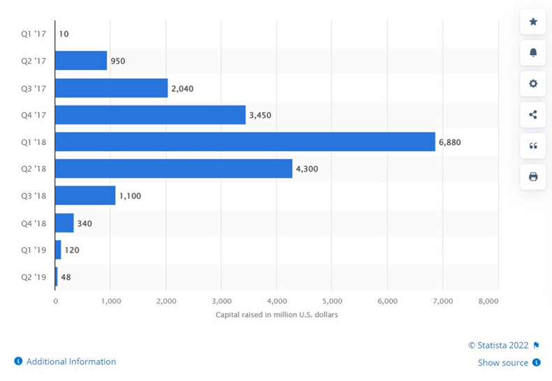 La imagen de arriba muestra la financiación total del ICO desde 2017 hasta 2019 en todo el mundo. Después de que estalló la burbuja en el primer trimestre de 2018, el capital recibido por los proyectos se mantuvo sólido hasta el segundo trimestre de 2018, cuando los capitalistas de riesgo finalmente se dieron cuenta de que el tren había pasado.