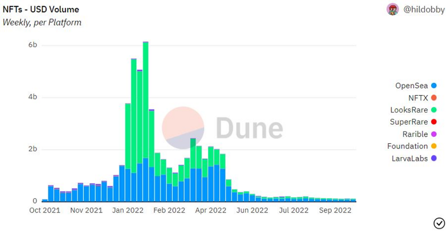 Sponsored SponsoredLa siguiente imagen describe mejor lo que sucedió en los próximos meses: el volumen de ventas semanales de NFT en dólares cayó significativamente desde un pico de 6 mil millones de dólares a aproximadamente 100 millones de dólares.