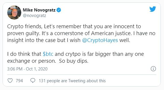 Los líderes del mercado cripto se apresuraron a opinar, incluido el toro de Bitcoin Mike Novogratz. El jefe de Galaxy Digital les recordó a sus amigos del mundo cripto que en Estados Unidos eres inocente hasta que se demuestre tu culpabilidad. Agregó que si bien no tiene ninguna información sobre el caso, le desea lo mejor a Arthur Hayes.