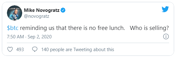 El rally de Bitcoin se está tomando un respiro hoy, con el precio de BTC cayendo casi un 6%, recordando a los alcistas de criptomoneda alfa que deberán ser pacientes. El precio de ETH bajó un 11% aún más severo a partir del mediodía del 2 de septiembre.