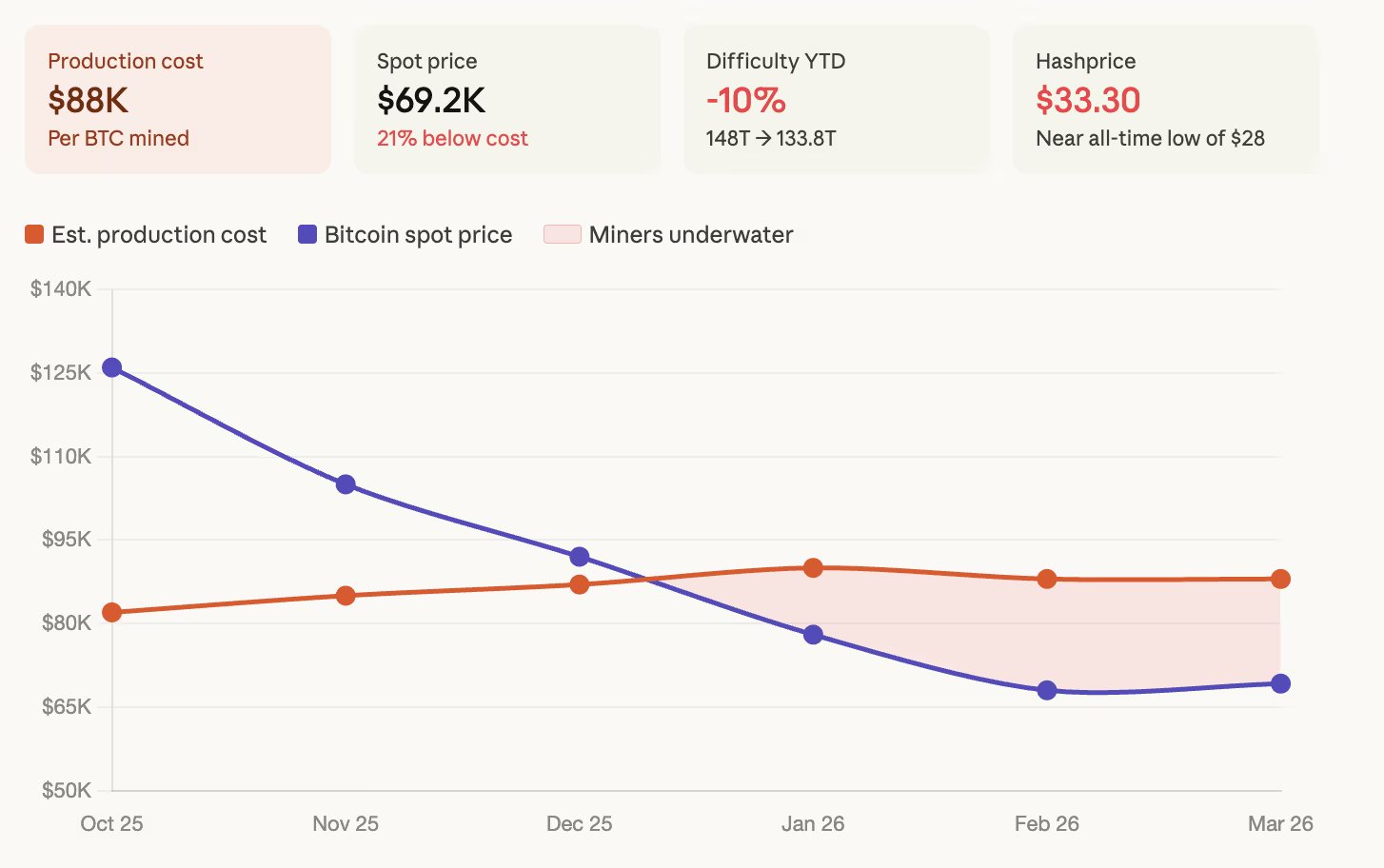 Los mineros de Bitcoin atraviesan uno de los momentos más complejos de los últimos años. En marzo de 2026, el costo de minar 1 BTC ronda los 88,000 dólares, mientras su precio se mantiene cerca de los 71,200 dólares, generando pérdidas inmediatas por cada bloque minado.