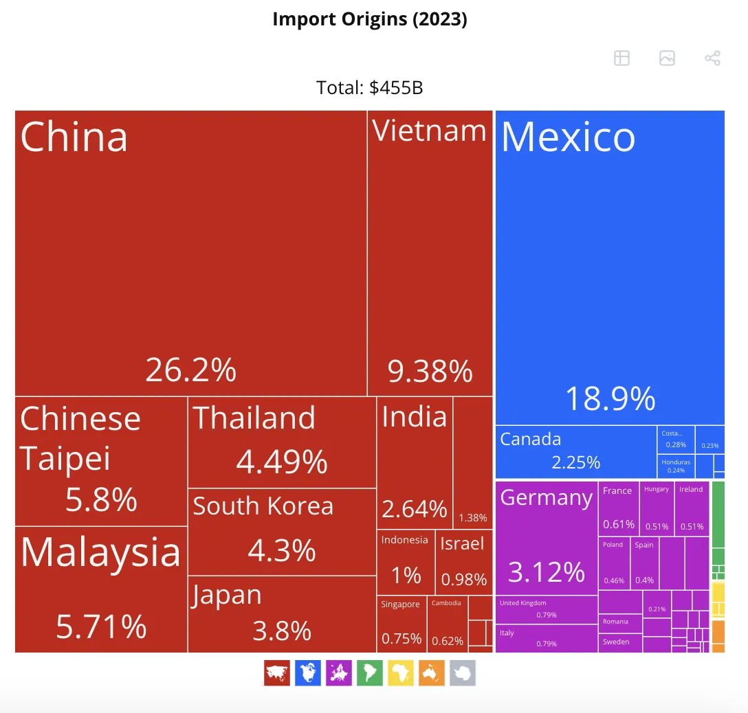 Según los datos del Observatorio de Complejidad Económica (OEC), en 2023, Estados Unidos se convirtió en el mayor importador mundial de maquinaria eléctrica y electrónica. Ese año, importó 455 mil millones de dólares en hardware, como circuitos integrados (ASIC), dispositivos semiconductores y transformadores eléctricos.