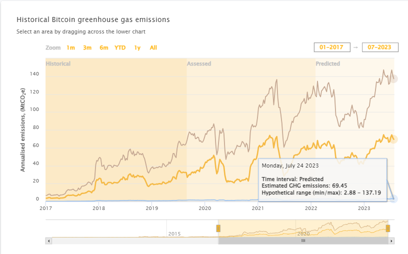 A todo esto, la huella de carbono de Bitcoin, las emisiones totales de gases de efecto invernadero provocadas por la actividad minera, asciende a 69.44 Mt CO2 anuales. El mundo entero emite 49,758 Mt CO2 anuales, donde la minería de Bitcoin aporta el 0.14 % de esa emisión.