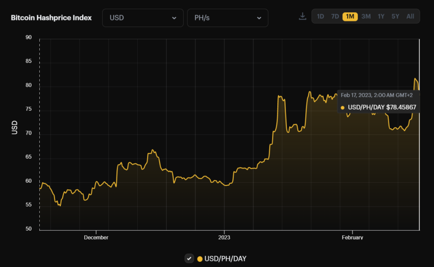 El Bitcoin Hashprice Index, que mide cuánto pueden ganar los mineros a partir de una determinada asignación de recursos computacionales medidos en petahashes por segundo, subió 30% este año a 78,45 dólares por petahash por segundo por día.