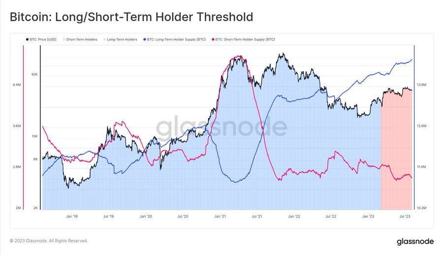 Sin embargo, a pesar de la reciente falta de movimiento en el precio de BTC, los datos de Glassnode muestran además que los activos de los holders a largo plazo alcanzaron un nuevo máximo histórico de 14,59 millones. Esto representa el 75% del suministro circulante de BTC y muestra su convicción en mantenerlo.