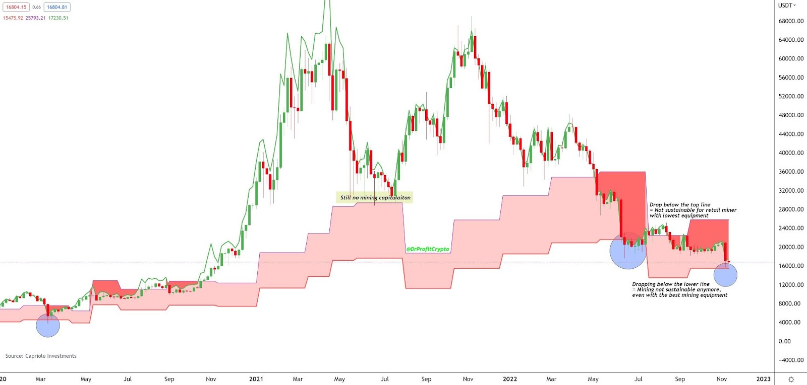 Más recientemente, el precio de BTC cayó por debajo de la parte inferior del indicador de costo de producción de Bitcoin en mayo-junio de 2022 y durante el colapso de COVID-19 en marzo de 2020 (círculos azules).