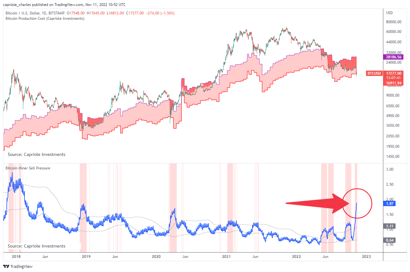 El indicador correlacionado con los costos de producción es Bitcoin Miner Sell Pressure. El autor de esta métrica, @caprioleio, explica que los valores más altos significan una presión de venta más alta de lo habitual. Por el contrario, ingresar al área roja indica una presión de venta extraordinariamente alta.