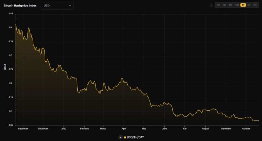 El índice, que mide la métrica a lo largo del tiempo, informa que el precio del hash, también conocido como rentabilidad minera, ha caído de 0.412 dólares/THs/día en octubre de 2021 a 0.068 dólares en la actualidad.