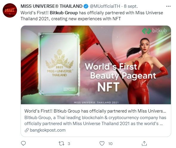 Bitkub Group se ha asociado con Miss Universo Tailandia para traer tokens no fungibles (NFT) al concurso.