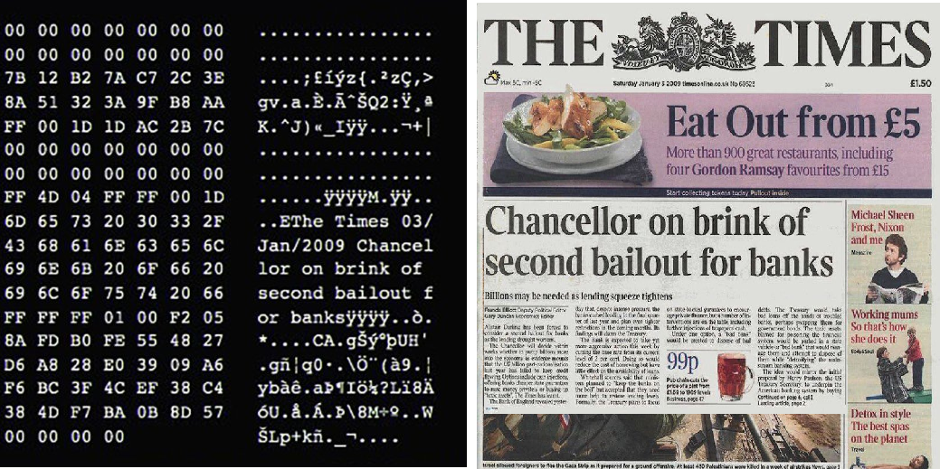 En él, el promotor cifró el mensaje: “La Canciller está a punto de aprobar un segundo paquete de rescate para los bancos”. Esta es una referencia al editorial del Times del 3 de enero de 2009, que señalaba la inestabilidad del actual sistema financiero.