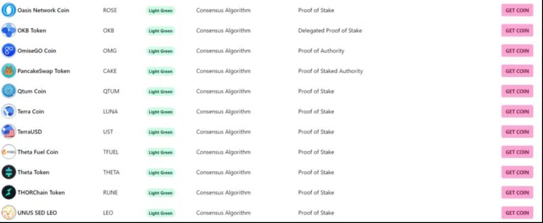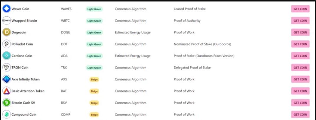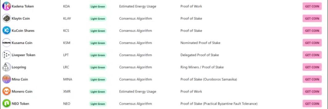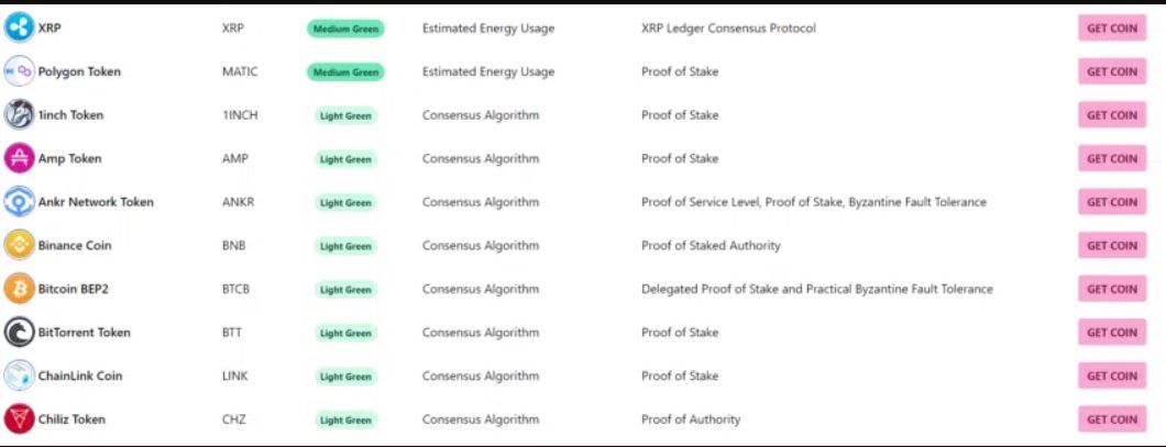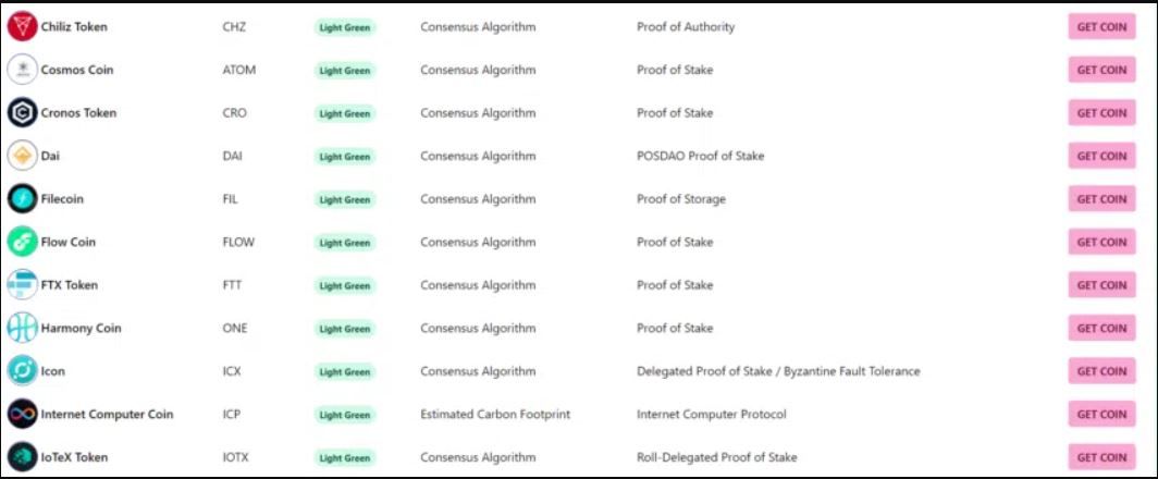 La lista Crypto Carbon Footprint clasifica las 100 criptomonedas principales por su huella de carbono. La lista detalla cómo cada moneda afecta el medio ambiente. Esto se calcula en función de su consumo de energía por transacción. La tabla muestra los resultados usando un esquema de color.
