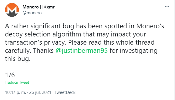 “Se ha detectado un error bastante significativo en el algoritmo de selección de señuelos de Monero que puede afectar la privacidad de su transacción. Por favor, lea todo este hilo con atención. Gracias @justinberman95 por investigar este error”.