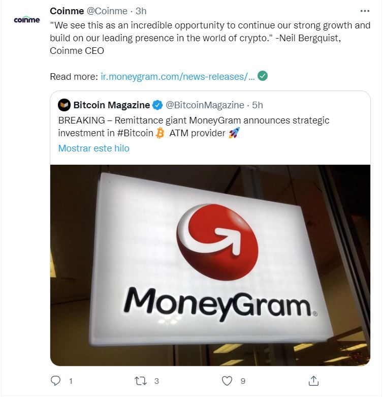 MoneyGram enfatiza que la inversión en Coinme ayudará a su crecimiento en su presencia en el mundo de las criptomonedas. Esta última se fundó en 2014 y actualmente opera en 48 estados con planes de expandirse internacionalmente. En noviembre, fue galardonada en el ranking “Deloitte Technology Fast 500”.