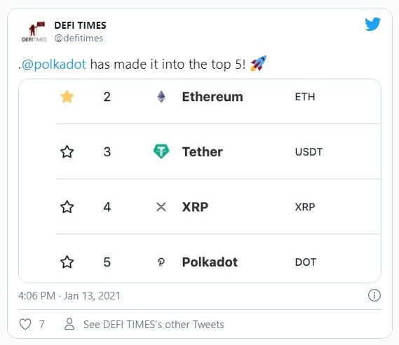 Hasta la fecha, el 63% del suministro del DOT está en juego en la red, y el precio del DOT aumentó más del 40% en poco más de un mes. La capitalización de mercado del token alcanzó los 15 mil millones de dólares hace unos días, desbancando a XRP para convertirse en la cuarta criptomoneda más grande.