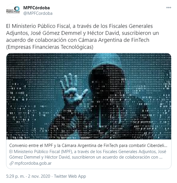 La alianza fue suscrita por José Gómez Demmel y Héctor David como representantes del MPF e Ignacio Plaza, presidente de la Cámara Argentina de FinTech. Según el hilo en la red social Twitter, la medida pretende combatir el cibercrimen: