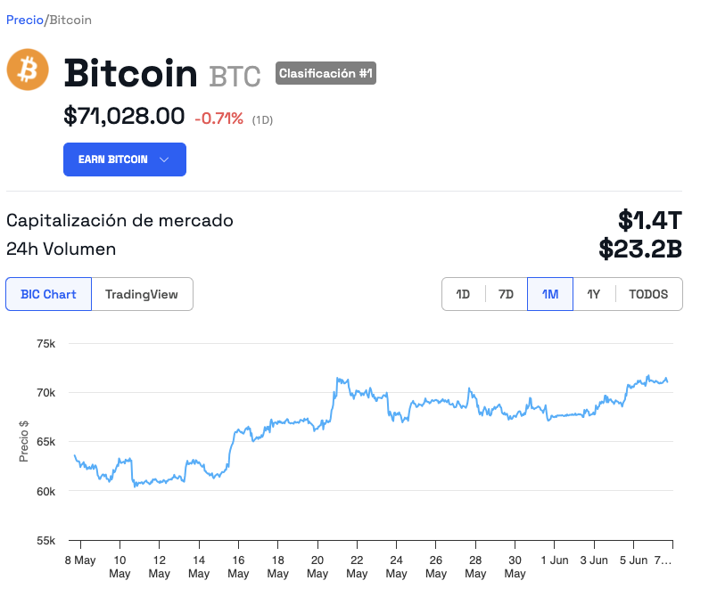 El precio de Bitcoin al 06 de junio es de 70,803 dólares, con una ganancia mayor a 3%. Como lo indicó Glassnode, desde abril, el precio de BTC oscila entre los 67,000 dólares y los 71,000 dólares, pausando la racha alcista que tuvo desde inicio de año, cuando la criptomoneda costaba 39,9 mil dólares.