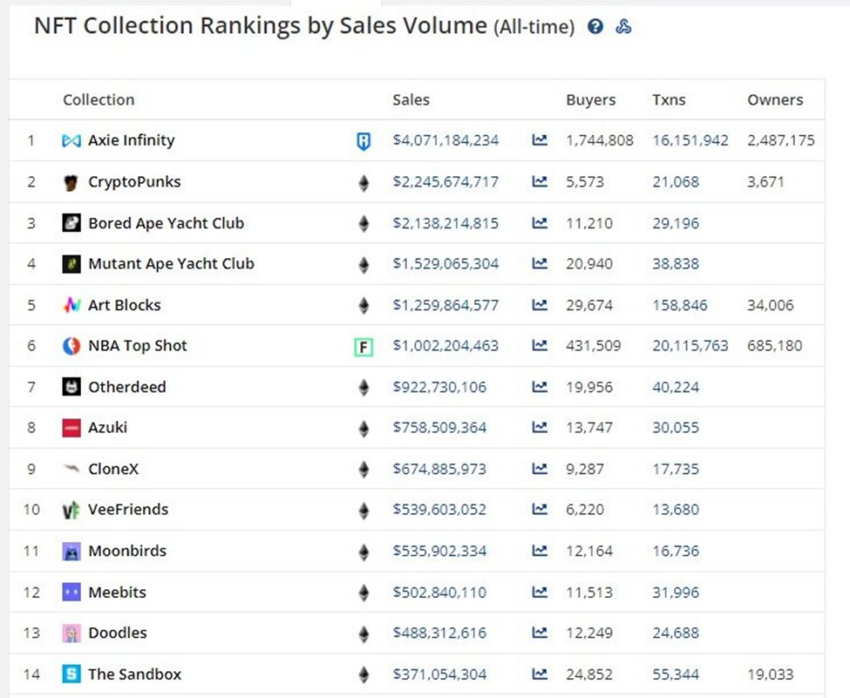 MAYC sigue detrás de sus proyectos hermanos Bored Ape Yacht Club (BAYC), CryptoPunks y Axie Infinity en las clasificaciones de volumen de ventas de todos los tiempos.