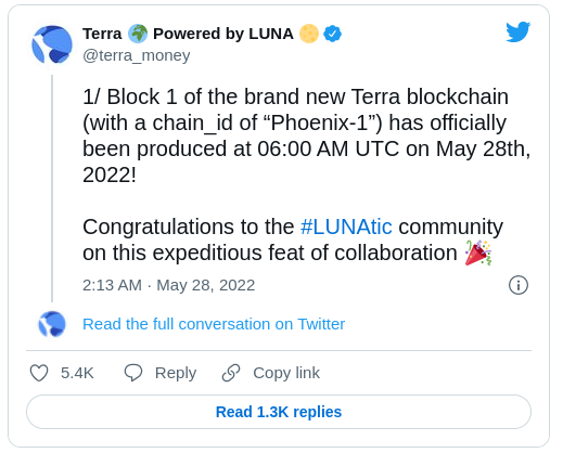 Sponsored“1/ ¡El bloque 1 de la nueva blockchain Terra (con un chain_id de “Phoenix-1”) se produjo oficialmente a las 06:00 a. m. UTC del 28 de mayo de 2022!