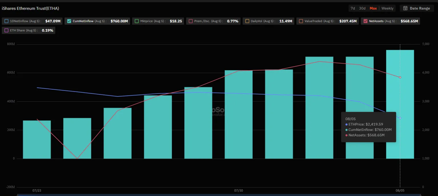 Los datos también mostraron que el iShares Ethereum Trust (ETHA) de BlackRock tenía activos netos de 568,65 millones de dólares en la misma fecha, clasificándolo como el tercer ETF spot de Ethereum más grande en el mercado estadounidense después de ETHE y Ethereum Trust de Grayscale.