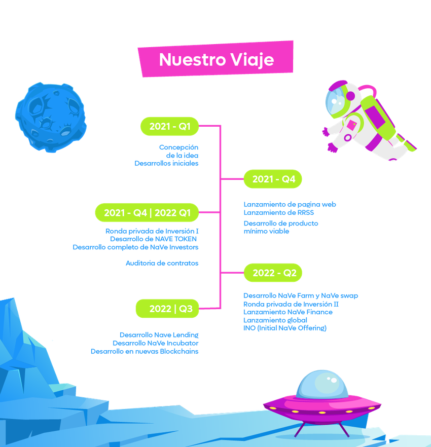 - Último trimestre de 2021: primer trimestre de 2022: 1era Ronda privada de inversión / Desarrollo de NAVE TOKEN / Desarrollo completo de Nave Investors / Auditoría de contratos