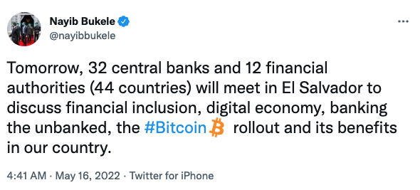 El evento que ocurrirá mañana, 17 de mayo, según el mandatario, constará entre los invitados a 32 bancos centrales y 12 autoridades del entorno financiero de diversos países, aglomerando 44 naciones en la reunión. Bukele mostrará “como se desplegó como los beneficios para el país” a modo de ejemplo.