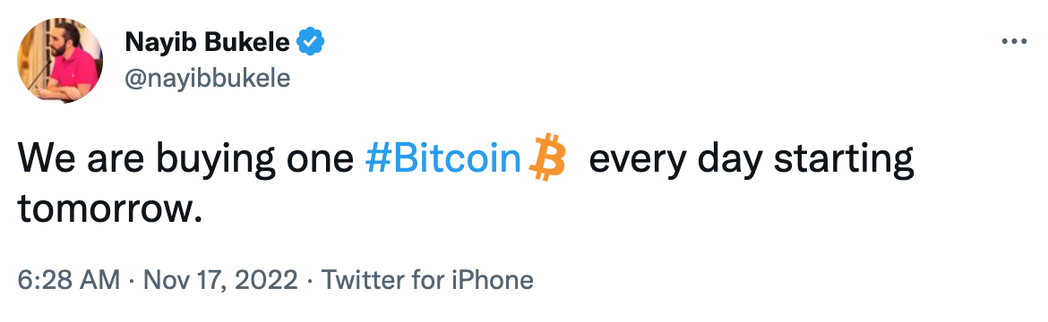 El momento actual escogido por Bukele para comenzar a realizar DCA, estrategia de comprar un activo de manera periódica sin importar su precio a vistas a largo plazo, puede sorprender ya que el mercado cripto se encuentra sumida en una tormenta mediática por la bancarrota de FTX y la fuga de Sam Bankman-Fried (SBF). Eso sí, la crisis de FTX ha provocado que el precio de BTC haya caído con fuerza alcanzando el rango de los 16.000 dólares, por ello Bukele y El Salvador están comprando la criptomoneda rey a un precio aún más reducido.