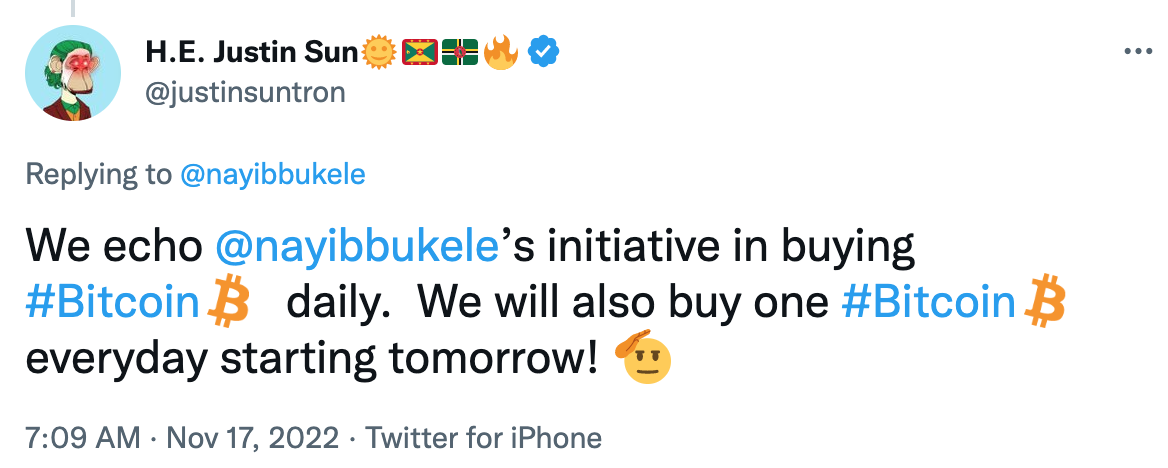 Justin Sun, fundador de Tron, se sumó rápidamente al nuevo plan de DCA del presidente de El Salvador como muestra de apoyo. Al igual que el Proof-of-Reserve de Changpeng Zhao, CEO de Binance, parece haberse convertido en una nueva tendencia entre los exchanges de criptomonedas, es posible que el comienzo de una compra escalonada de bitcoin podría extenderse entre varios actores de la industria cripto. BeInCrypto ha preguntado a ambos a qué presenten datos on-chain o pruebas claras de las compras para que no se quede en palabras, sino en hechos.
